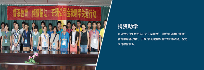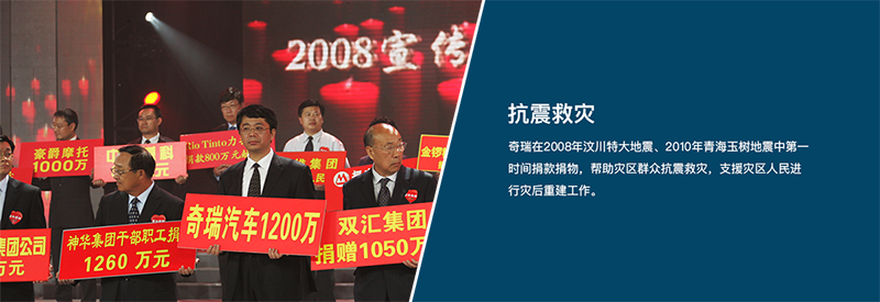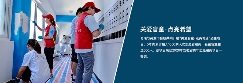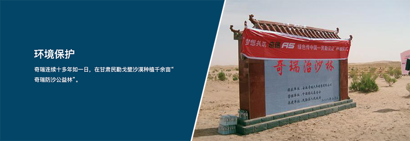 奇瑞牢记对社会民生的责任,一直积极投入公益事业,在全球范围开展环境保护、精准扶贫、捐资助学等各类公益慈善行动,连续13年开展贫困助学行动,连续11年在戈壁荒滩种植防沙公益林,连续6年关爱盲童教育,连续5年通过“先锋车队”温暖城市角落……先后获得“中华慈善奖”、“中国汽车企业公民”“中国社会责任杰出企业奖”等全国级荣誉,为践行企业公民责任增添注解。